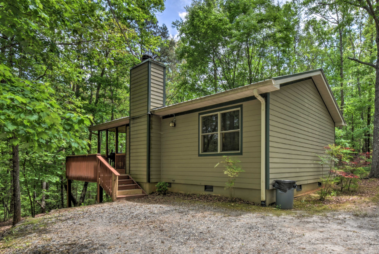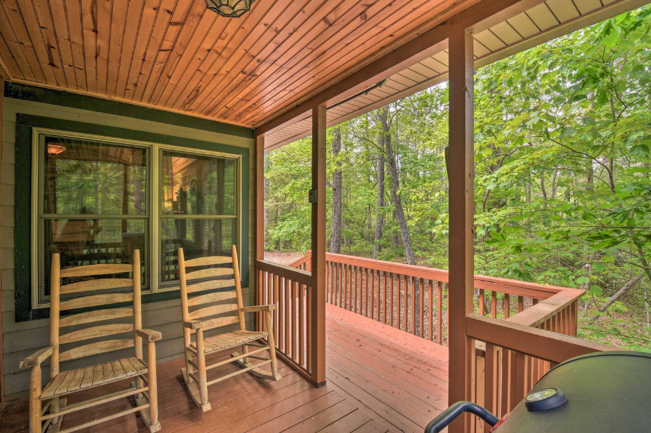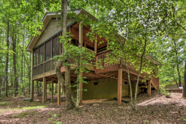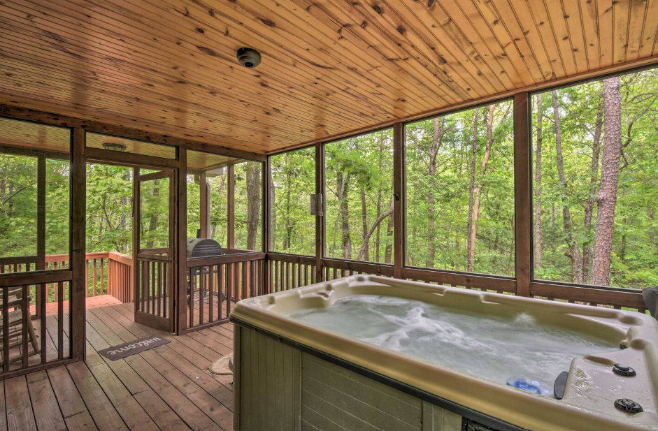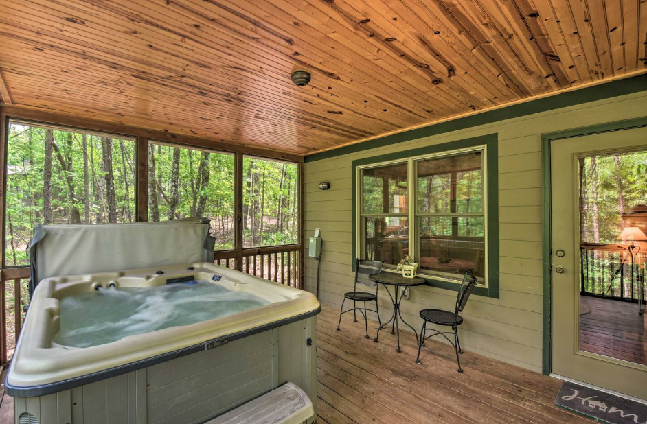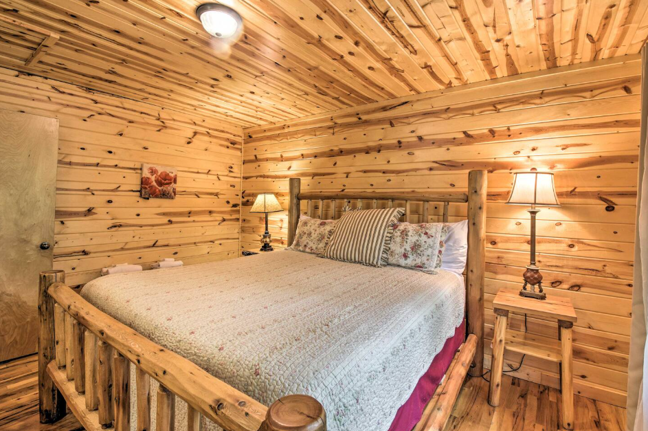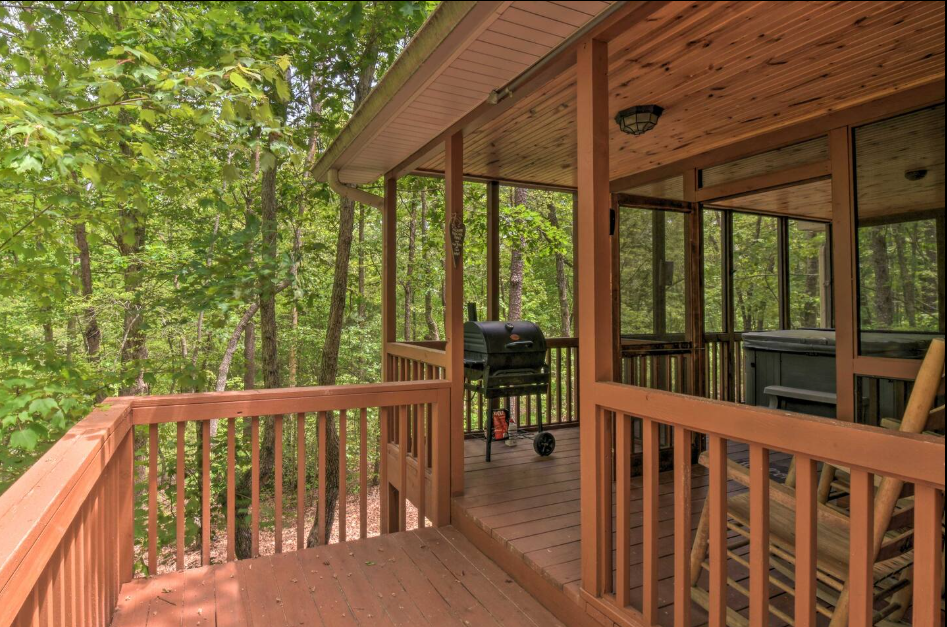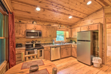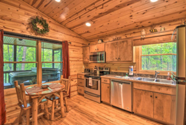 This spacious one bedroom cabin features a secluded screened in porch with a luxurious private hot tub and Adirondack rocking chairs. It is perfect for a romantic get-away or wedding accommodations offering a plush king-size bed, large full bath, stone fireplace, fully equipped stainless steel kitchen, and flat panel satellite television.