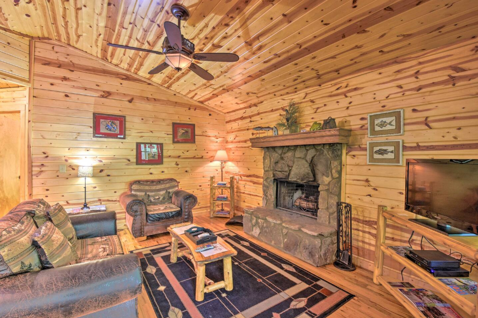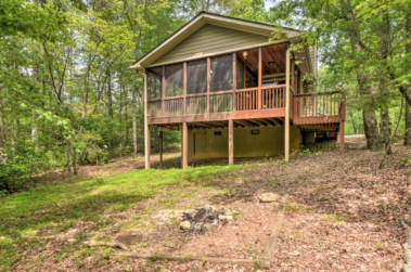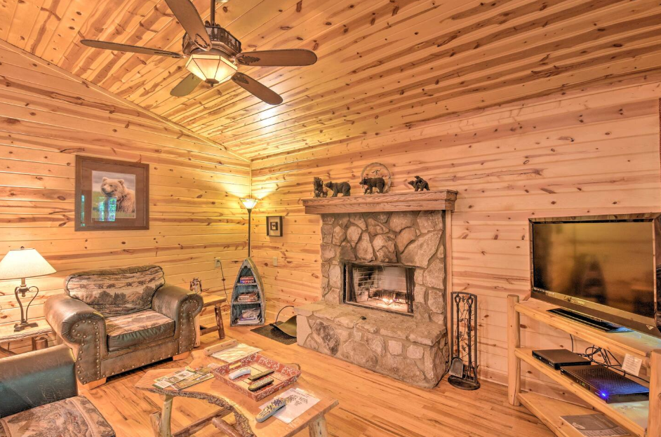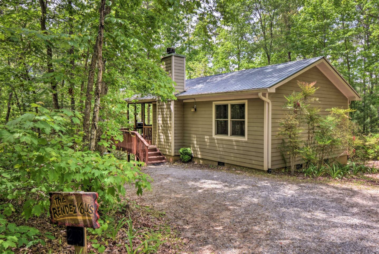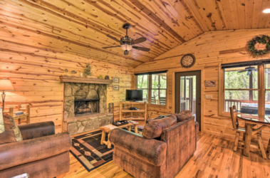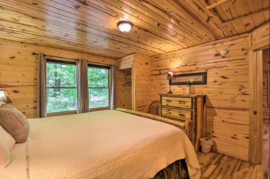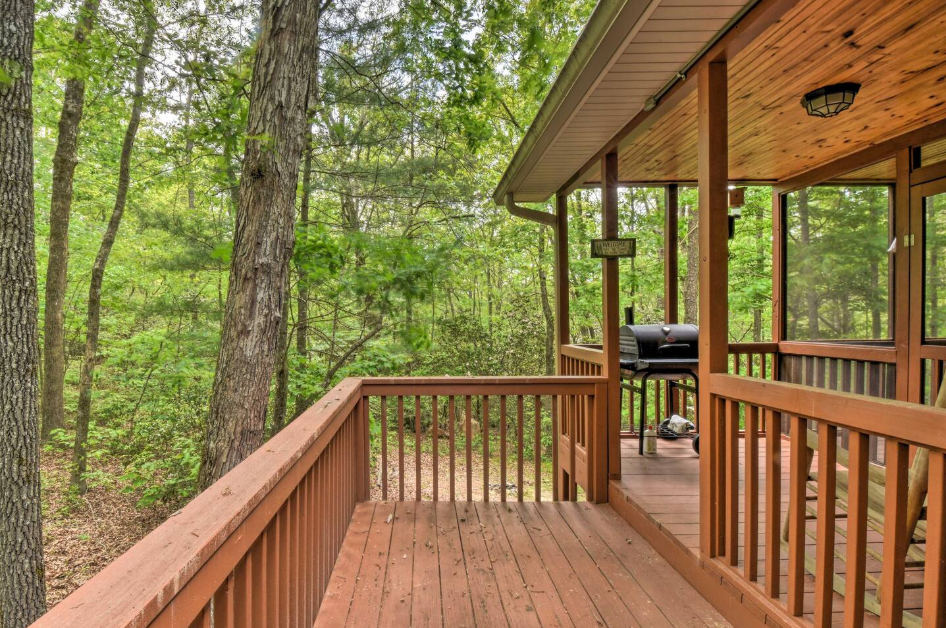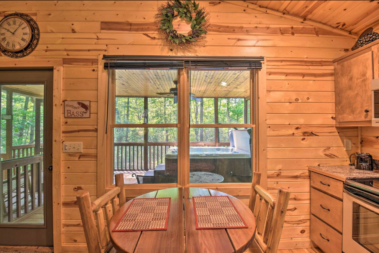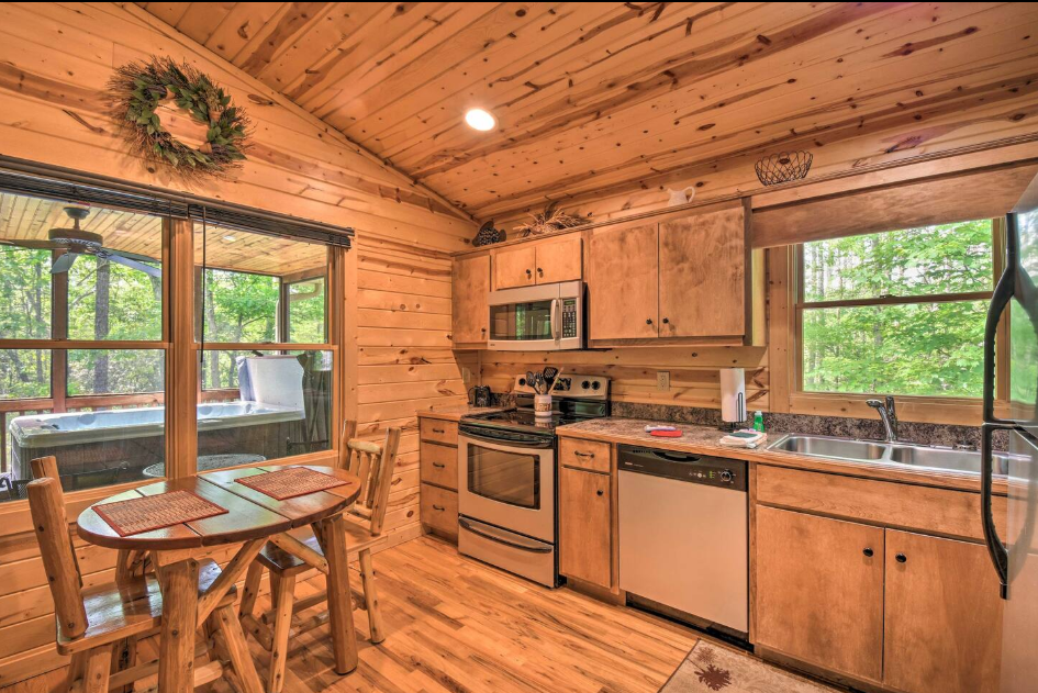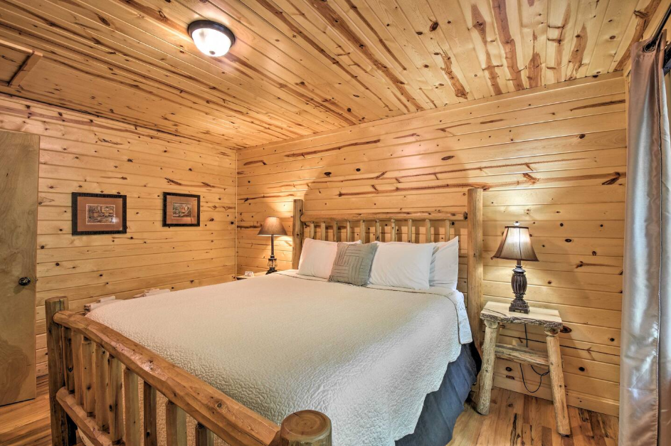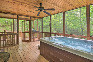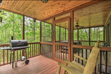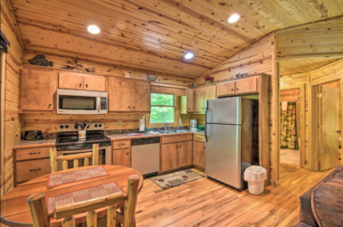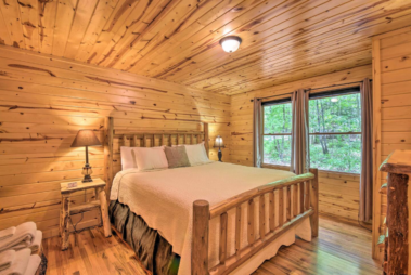 This spacious one bedroom cabin features a secluded screened in porch with a luxurious private hot tub and Adirondack rocking chairs. It is perfect for a romantic get-away or wedding accommodations offering a plush king-size bed, large full bath, stone fireplace, fully equipped stainless steel kitchen, and flat panel satellite television.