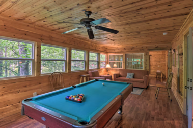 This two story, six-bedroom villa has an open living-dining-kitchen area complete with a stone fireplace and flat panel satellite television. Upstairs there are two bedrooms, one bedroom with a king-sized bed and the other bedroom with a queen-sized bed and a spacious full bathroom. Off the living area there is a meeting room with a pool table or gathering space with a wonderful woodland view that offers additional sleeping accommodations. Downstairs are four lovely bedrooms. One has a king size bed and the other three bedrooms have queen beds. There are three full bathrooms downstairs.